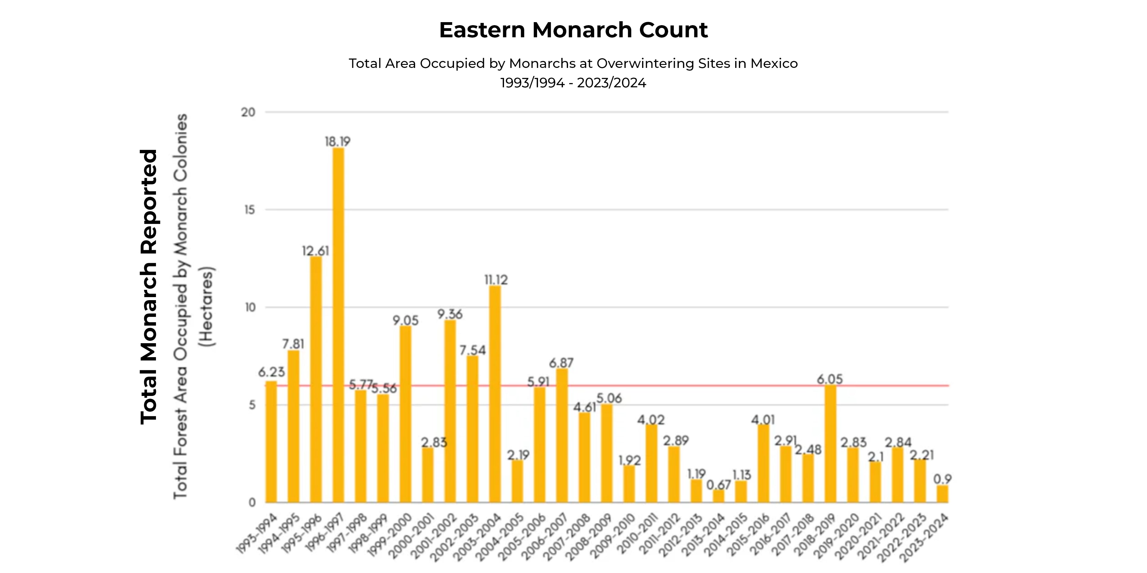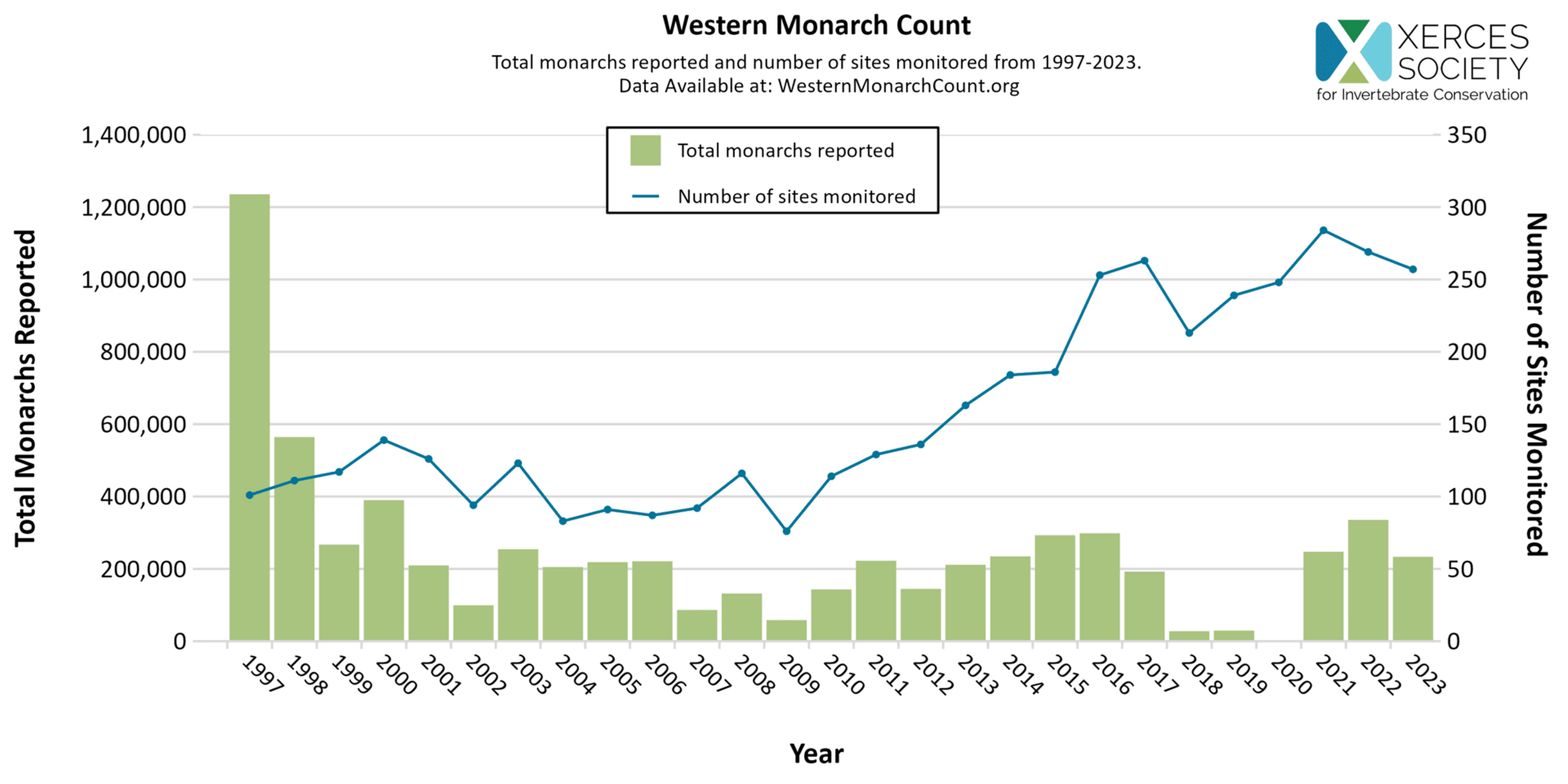 In 2023, Eastern Monarchs saw a 59% decline in the forest of Mexico and Western Monarchs saw a population count loss of 102,000. Over all in the past two decades, monarch populations have plummeted by more than 90%. Western monarchs, which migrate to coastal California, have experienced a jaw-dropping 99.5% decline since the 1990s. Where there were once 1.2 million monarchs in the West in 1997, fewer than 30,000 remained by 2019. Eastern monarchs, clustering in Mexico, saw numbers fall from 384 million in 1996 to fewer than 60 million in 2019. In 2013, this population reached a low of just 14 million.
